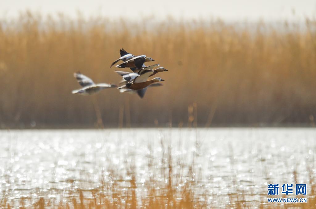這是在位于內(nèi)蒙古阿拉善盟額濟(jì)納旗的居延海濕地拍攝的候鳥(niǎo)(2021年4月13日攝)。新華社記者 連振 攝