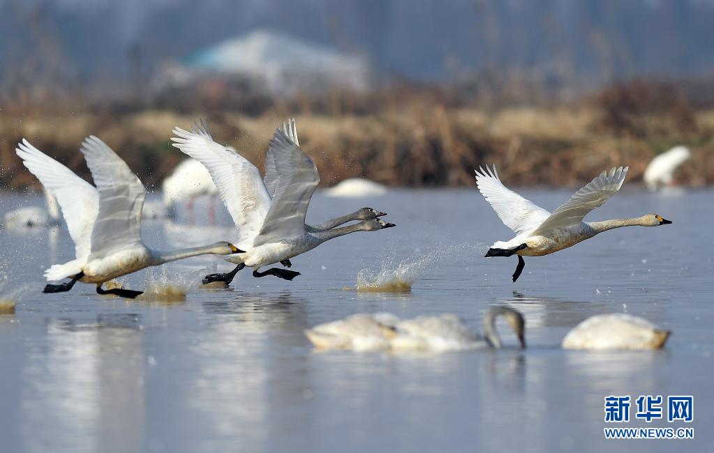 候鳥(niǎo)在位于江西鄱陽(yáng)湖畔的五星農(nóng)場(chǎng)境內(nèi)振翅起飛(2018年1月11日攝)。新華社記者 萬(wàn)象 攝
