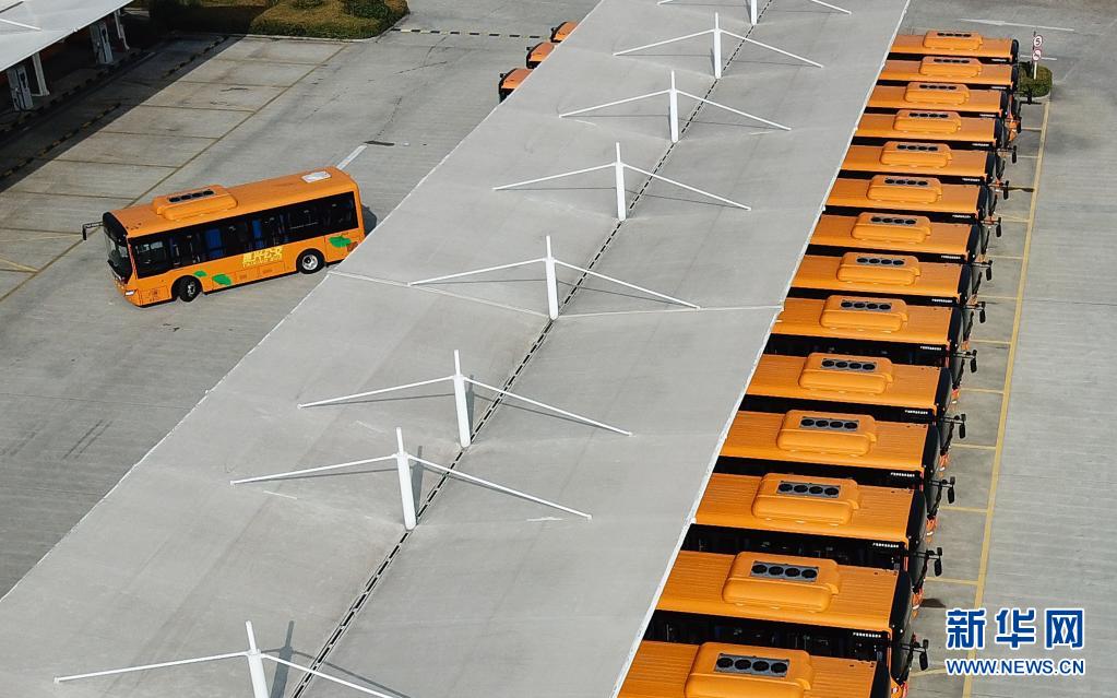 在江蘇省泰興市公交總站,一輛純電動(dòng)公交車入站充電(2018年11月10日攝,無(wú)人機(jī)照片)。新華社記者 季春鵬 攝