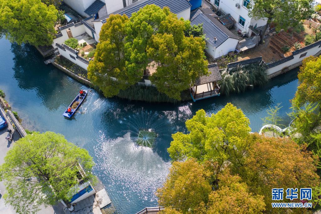 浙江省長(zhǎng)興縣龍山街道渚山村,保潔人員進(jìn)行日常河道護(hù)理巡查(2020年4月9日攝,無(wú)人機(jī)照片)。新華社記者 徐昱 攝
