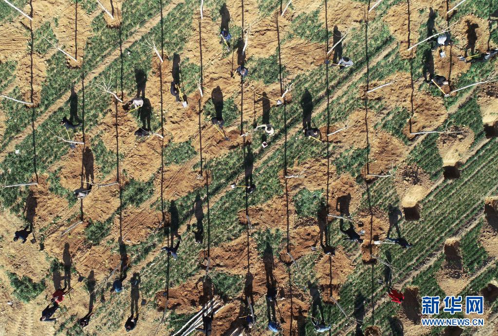 志愿者在河北省武安市伯延鎮(zhèn)伯延村植樹(shù)(2019年3月12日攝,無(wú)人機(jī)照片)。新華社記者 王曉 攝