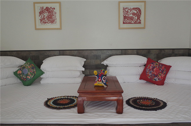 “大到喝茶的桌椅,小到墻上的剪紙,都是找專門手藝人做的。”小雅指著“炕”上的花坐墊說,這也是拿小孩不穿的布帛縫起來的,展現(xiàn)陜北特色的“百家衣”風(fēng)格。陜北炕比較冰冷,她們就用木頭把炕包起來,再鋪上軟墊。