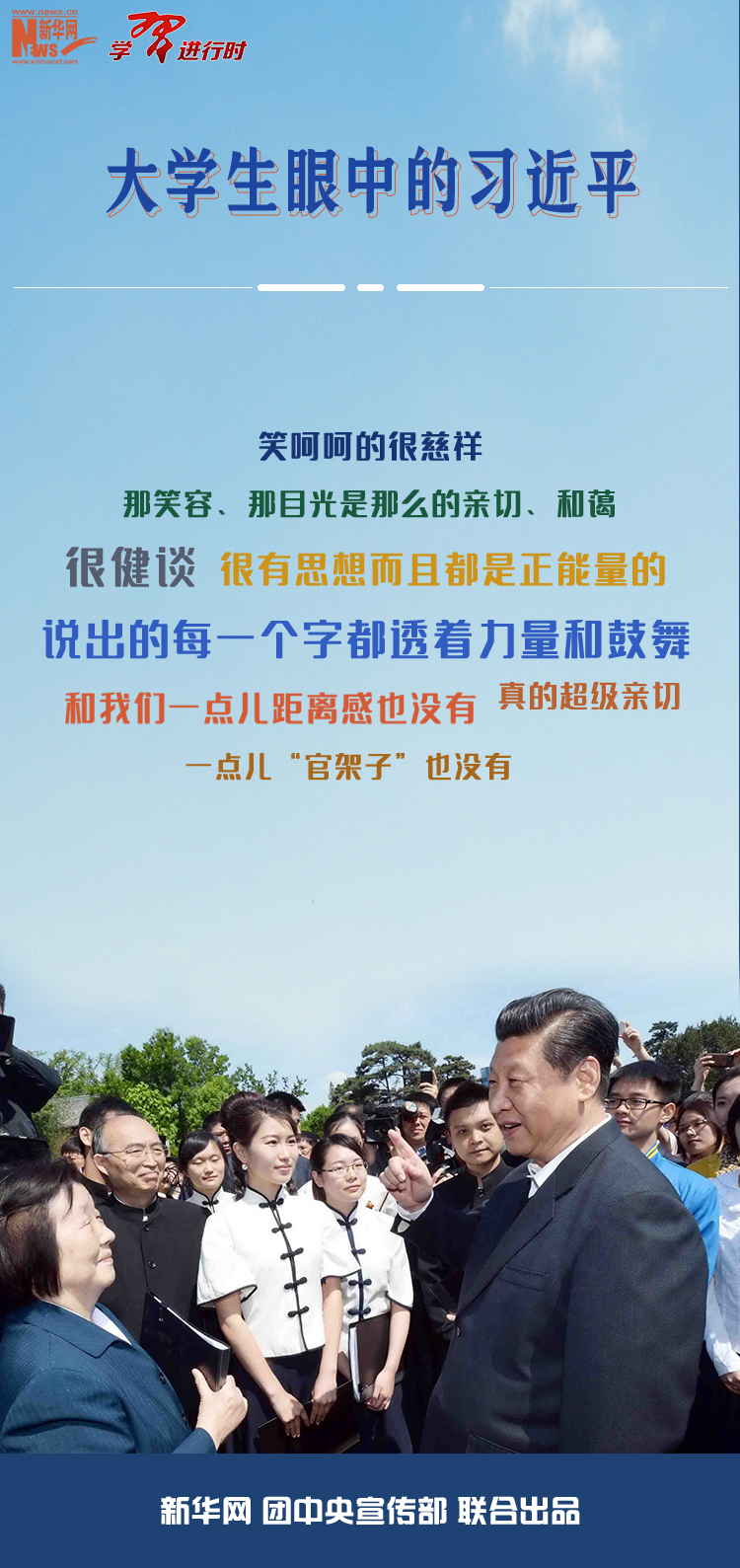 【學習進行時】習近平對青年特別是大學生的重視關懷始終如一,多次與青年大學生交流交心交友。凡是與習近平有接觸的大學生,談起和他交往的一點一滴都記憶猶新,都認為習近平的一言一行一直深深影響著他們、激勵著他們。新華社《學習進行時》為您整理了不同時期多位大學生對習近平的深刻印象,與您共同感受這份親切與溫暖。