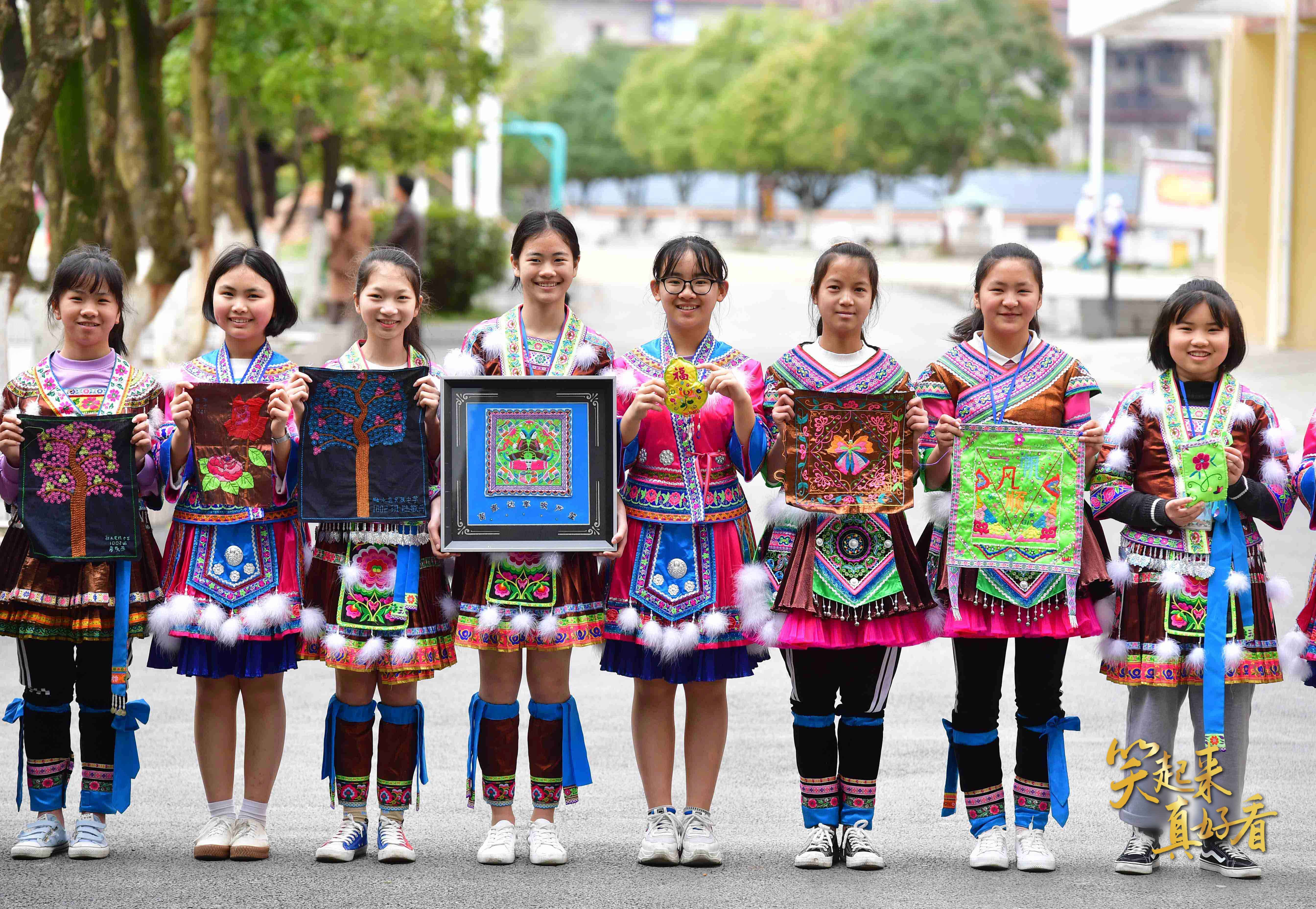 △2019年3月22日,廣西融水苗族自治縣民族中學(xué)女童班的學(xué)生展示刺繡作品。