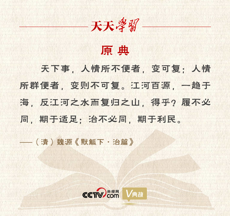 《默觚》是中國近代思想家魏源的哲學(xué)著作。魏源從歷史自身的“自變性”去探求歷史發(fā)展的驅(qū)動力,認為歷史變化發(fā)展的標(biāo)準(zhǔn)是“便民”。為此,他用生動的比喻加以說明:“履不必同,期于適足;治不必同,期于利民。”意思是說,每一個人的鞋子大小不必相同,關(guān)鍵是要適合自己的腳;每個國家的治理方法不必雷同,關(guān)鍵是要有利于人民。