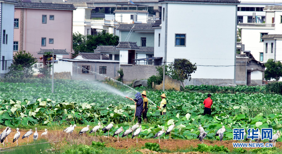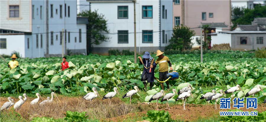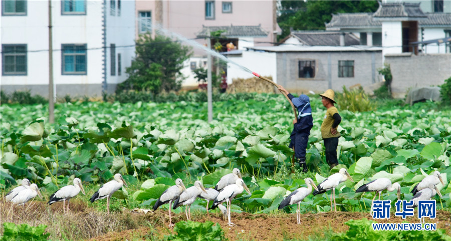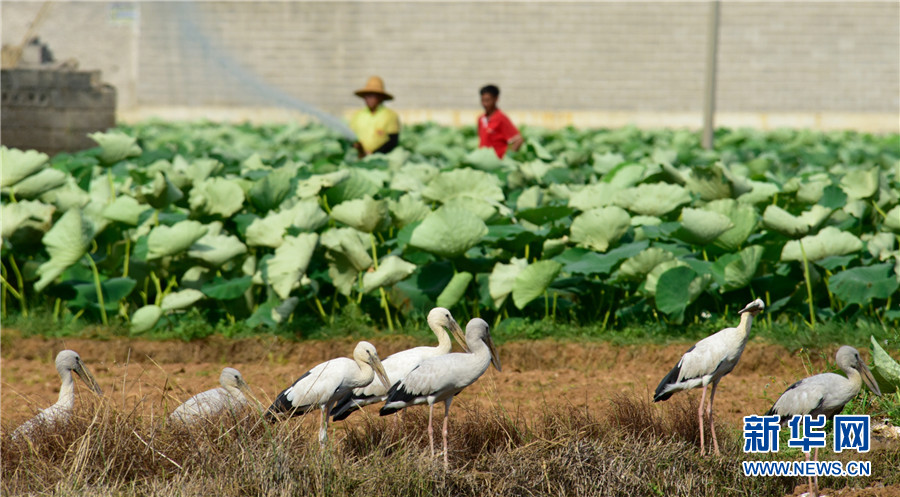 近日,云南省彌勒市竹園鎮(zhèn)農民在荷田間勞作,不遠處許多鉗嘴鸛在田邊地頭棲息覓食,一幅人鳥和諧的生態(tài)畫卷徐徐展開。2006年,中國在云南大理首次記錄到鉗嘴鸛。近年來,隨著生態(tài)環(huán)境不斷改善,云南多地均發(fā)現(xiàn)鉗嘴鸛。新華網(wǎng)發(fā)(普佳勇攝影報道)