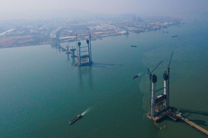 距此正北38公里,內(nèi)伶仃洋里,連接珠江兩岸的又一超級跨海工程建設(shè)正如火如荼——深中通道初具規(guī)模。在中山市珠江西岸的馬鞍島旁,一排巨大橋墩延伸向水天一色處,遠(yuǎn)處伶仃洋大橋主塔已施工至210米高程,中山大橋主塔已施工至150米高程……