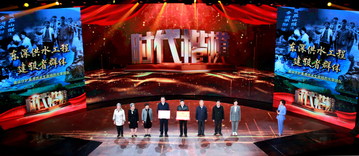 東深供水工程建設(shè)者群體代表在“時代楷模”發(fā)布儀式上領(lǐng)取“時代楷模”獎牌和證書(2021年4月18日攝)。 新華社記者 潘旭 攝