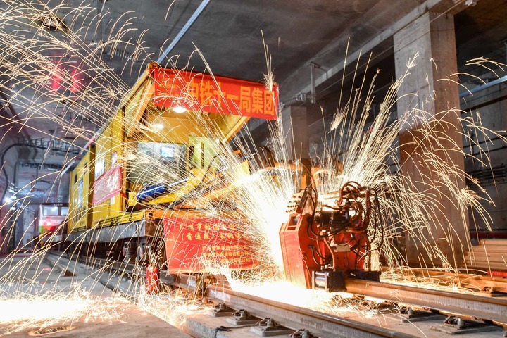 中鐵十一局軌道焊機(jī)在焊接廣州地鐵18號線首通段最后一個鋼軌接頭(2021年4月20日攝)。 新華社記者 劉大偉 攝