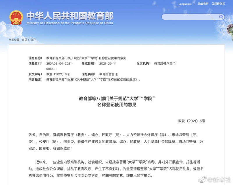 教育部等八部門近日印發(fā)意見,規(guī)范大學(xué)學(xué)院名稱登記使用。教育部表示,一些企業(yè)內(nèi)設(shè)培訓(xùn)機(jī)構(gòu)、社會組織,未經(jīng)批準(zhǔn)冒用“大學(xué)”“學(xué)院”名稱,并對外開展宣傳、招生等活動,造成社會公眾誤解,擾亂了教育秩序。意見明確,“大學(xué)”“學(xué)院”名稱經(jīng)審批方可使用。大學(xué)由國務(wù)院教育行政部門依法審批或備案;學(xué)院根據(jù)辦學(xué)層次、類型、法人性質(zhì)等,由中央和國家有關(guān)部門或省級人民政府及其有關(guān)部門依法審批。涉及機(jī)構(gòu)編制事項(xiàng)的,按照機(jī)構(gòu)編制管理權(quán)限和規(guī)定程序,報(bào)機(jī)構(gòu)編制部門審批。(記者胡浩)