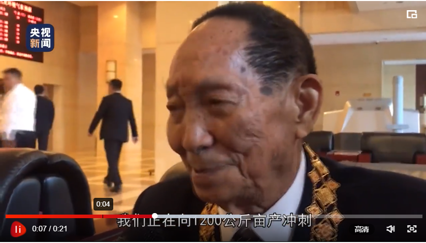 現場視頻顯示,習近平和袁隆平在臺上進行了簡短交流。袁隆平在接受采訪時告訴記者:“總書記問我,有什么進展?我說,我們正在向1200公斤畝產沖刺!”