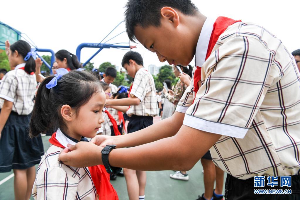 5月31日,南寧市濱湖路小學(xué)高年級的少先隊員在入隊儀式上為新入隊的同學(xué)系紅領(lǐng)巾。新華社記者 曹祎銘 攝