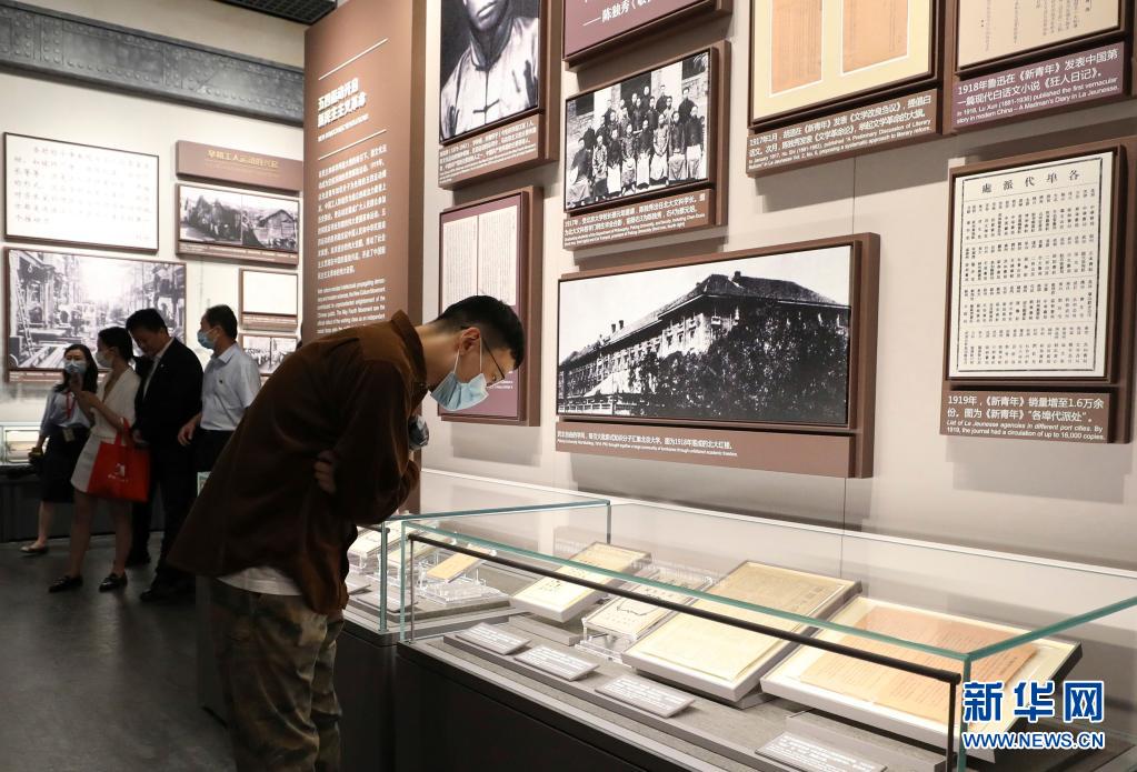 大型立體式視覺置景名為“主義的抉擇”,100件五四運動前后傳播馬克思主義、社會主義的報紙雜志,錯落陳列在玻璃墻上。其中,《新青年》第6卷第5號“馬克思研究專號”在前端“高光”展示,這期“專號”標(biāo)志著馬克思主義在中國的傳播進(jìn)入了較為系統(tǒng)的階段(6月1日攝)。新華社記者 劉穎 攝