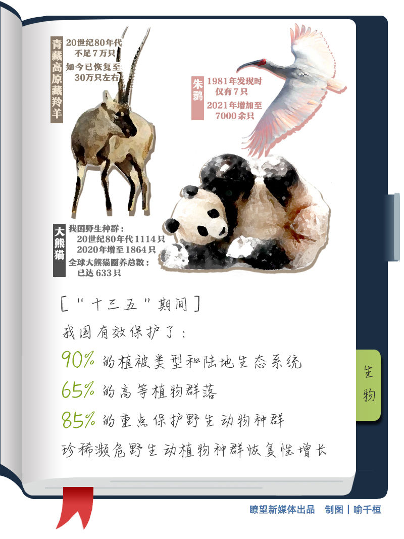 瀕危野生動(dòng)植物保護(hù)不斷強(qiáng)化。“十三五”期間,我國(guó)有效保護(hù)了90%的植被類(lèi)型和陸地生態(tài)系統(tǒng)、65%的高等植物群落,85%的重點(diǎn)保護(hù)野生動(dòng)物種群,大熊貓、朱鹮、藏羚羊、蘇鐵等珍稀瀕危野生動(dòng)植物種群實(shí)現(xiàn)恢復(fù)性增長(zhǎng)。