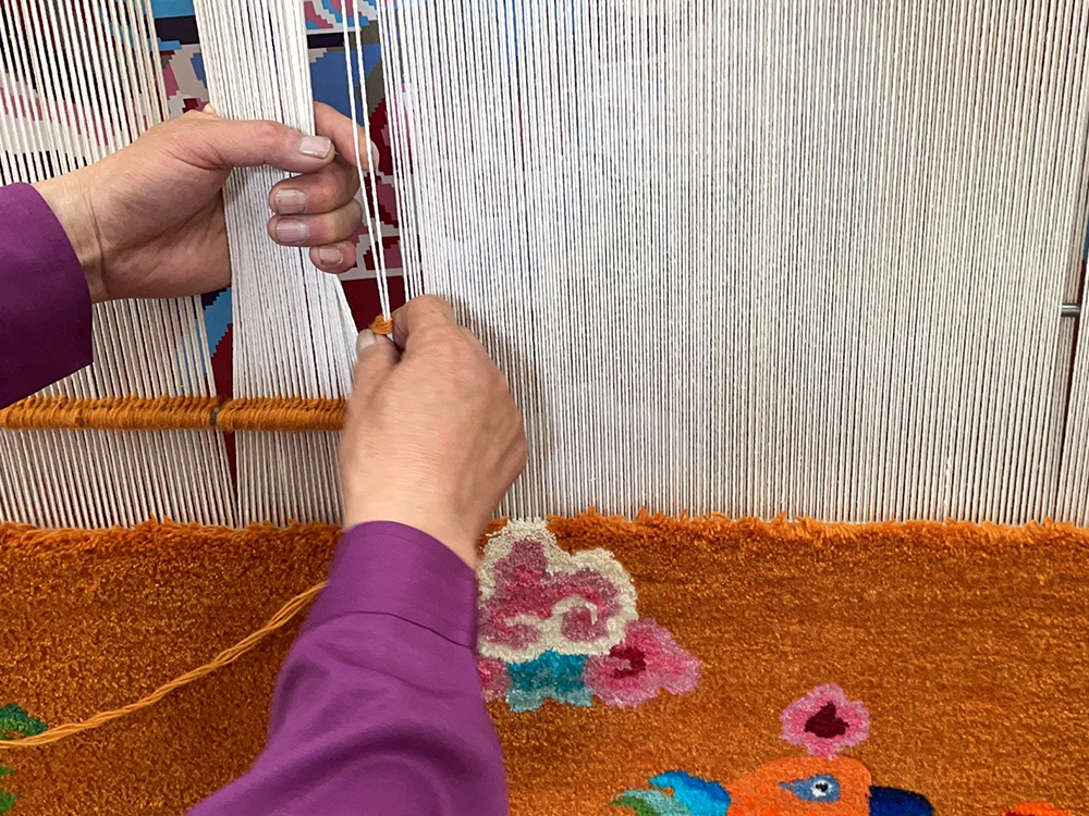 加牙藏毯以優(yōu)質(zhì)藏系綿羊毛為原料,運用手工連環(huán)編結(jié)法,染色時使用天然植物和礦物質(zhì)染料低溫染紗。由于選毛、紡紗、編織等全靠手工完成,加牙藏毯的每道工序都需要匠人的非凡功力。一張張富有生命力的手工藏毯,就誕生在這些匠人的指尖上。