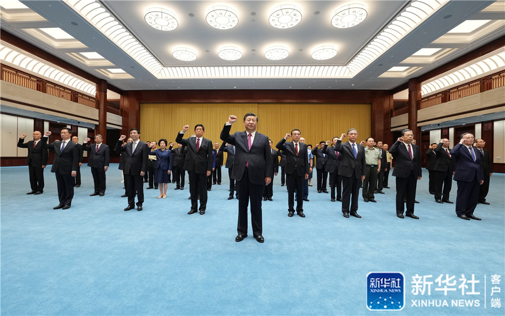 6月18日,黨和國家領(lǐng)導(dǎo)人習(xí)近平、李克強(qiáng)、栗戰(zhàn)書、汪洋、王滬寧、趙樂際、韓正、王岐山等在中國共產(chǎn)黨歷史展覽館參觀“‘不忘初心、牢記使命’中國共產(chǎn)黨歷史展覽”。這是參觀結(jié)束后,習(xí)近平帶領(lǐng)黨員領(lǐng)導(dǎo)同志一起重溫入黨誓詞。新華社記者 李學(xué)仁 攝
