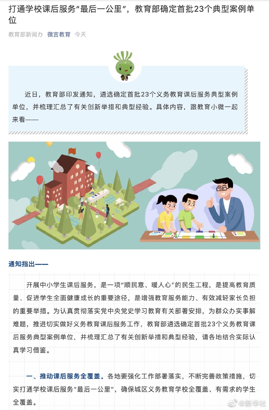 據(jù)教育部政務(wù)新媒體“微言教育”公眾號(hào)22日消息,教育部近日印發(fā)通知,為推進(jìn)做好義務(wù)教育課后服務(wù)工作,遴選確定首批23個(gè)義務(wù)教育課后服務(wù)典型案例單位,并梳理匯總了有關(guān)創(chuàng)新舉措和典型經(jīng)驗(yàn),要求各地結(jié)合實(shí)際學(xué)習(xí)借鑒。通知指出,課后服務(wù)結(jié)束時(shí)間原則上不早于當(dāng)?shù)仄毡榈恼O掳鄷r(shí)間后半小時(shí);學(xué)校對(duì)有特殊需要的學(xué)生,可以提供延時(shí)托管服務(wù),切實(shí)解決好家長(zhǎng)接學(xué)生困難問(wèn)題。學(xué)校服務(wù)性收費(fèi)和代收費(fèi)具體政策由各省份制訂,嚴(yán)禁以課后服務(wù)名義亂收費(fèi)。 (記者余俊杰)