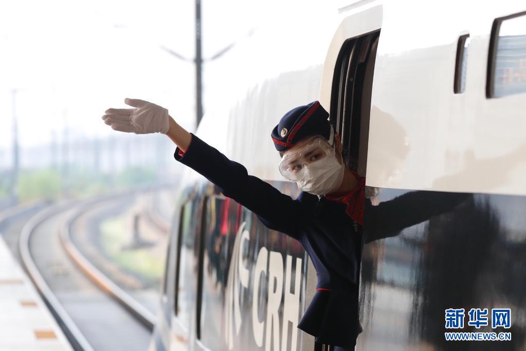 在武漢站,G431次列車乘務(wù)員艾婷婷在發(fā)車前向乘客揮手(2020年4月8日攝)。這是武漢市正式解除離漢離鄂通道管控措施后開往湖北省外的首趟始發(fā)列車。新華社記者 沈伯韓 攝
