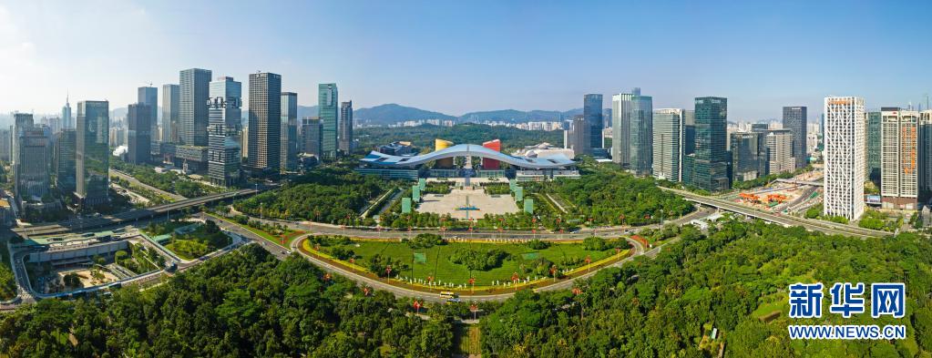 這是2020年10月2日拍攝的深圳市民中心和蓮花山公園一線(無人機照片)。新華社記者 梁旭 攝