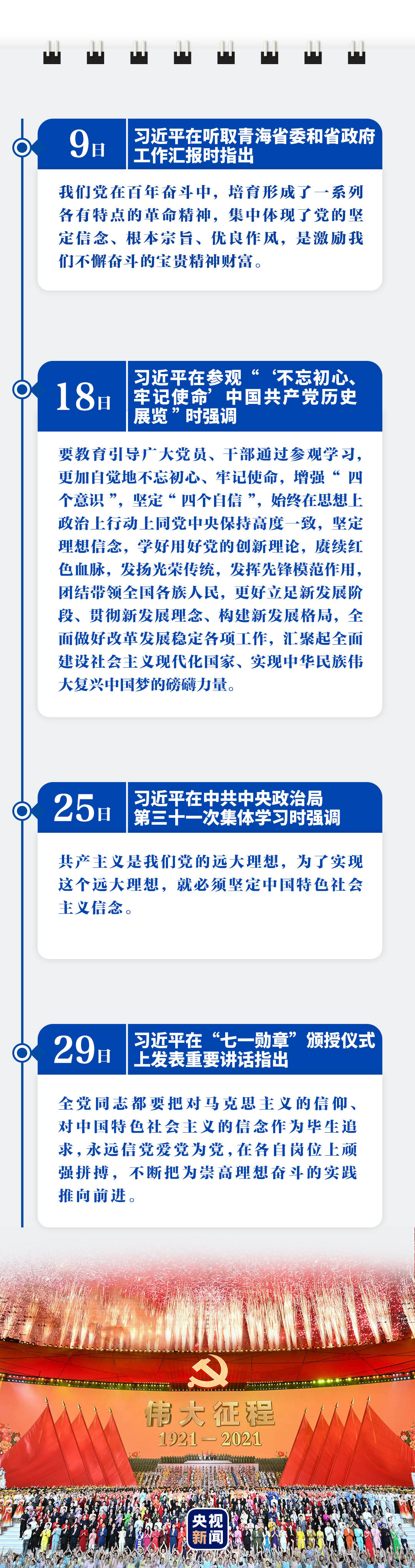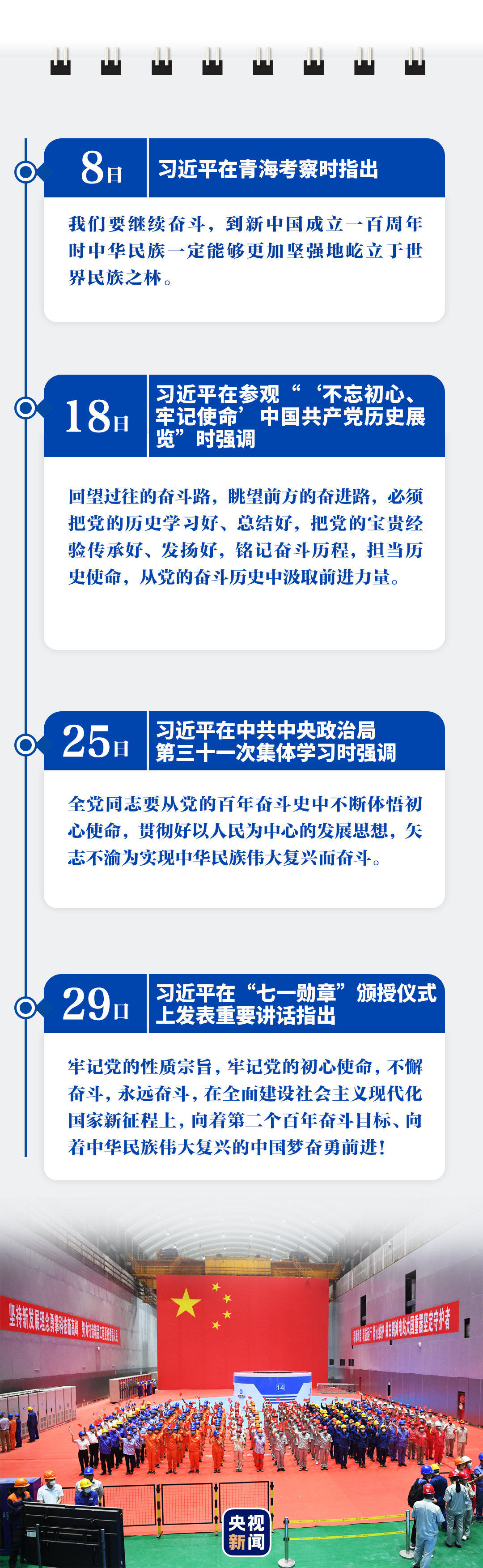 赴中國共產(chǎn)黨歷史展覽館,參觀“‘不忘初心、牢記使命’中國共產(chǎn)黨歷史展覽”,并帶領(lǐng)黨員領(lǐng)導(dǎo)同志重溫入黨誓詞;赴北大紅樓參觀主題展覽、到豐澤園毛澤東同志故居參觀瞻仰,主持中央政治局第三十一次集體學(xué)習(xí);觀看慶祝中國共產(chǎn)黨成立100周年文藝演出《偉大征程》;向“七一勛章”獲得者頒授勛章,并發(fā)表重要講話……習(xí)近平總書記6月的很多重要活動(dòng),都與慶祝建黨百年有關(guān)。