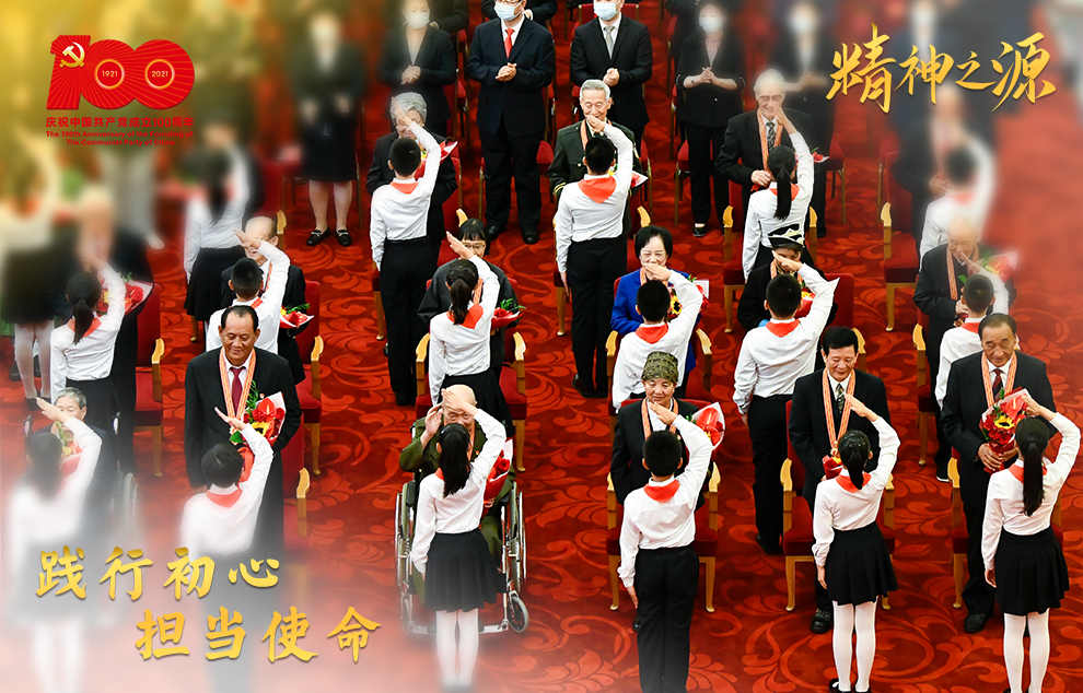 6月29日,慶祝中國共產(chǎn)黨成立100周年“七一勛章”頒授儀式在北京人民大會堂金色大廳隆重舉行。這是少先隊(duì)員向勛章獲得者獻(xiàn)花,敬禮致意。