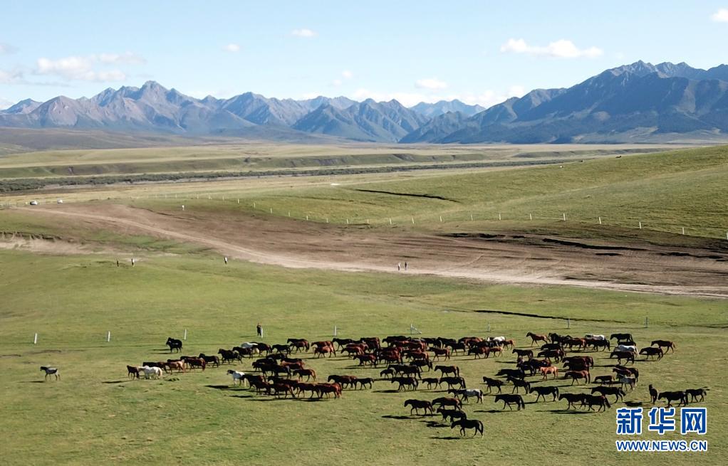在祁連山腳下的山丹馬場拍攝的馬群(2019年9月10日攝,無人機照片)。新華社記者 馬寧 攝
