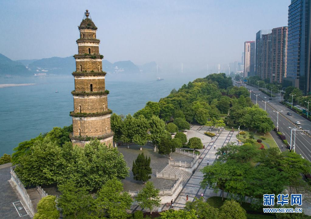 湖北省宜昌市江灘公園一角(2018年4月30日攝,無人機照片)。新華社記者 肖藝九 攝