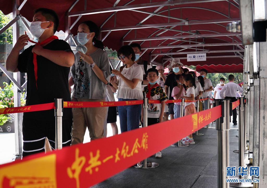 7月11日,觀眾在中共一大紀(jì)念館前的遮陽(yáng)棚下排隊(duì)等待參觀。新華社記者 劉穎 攝
