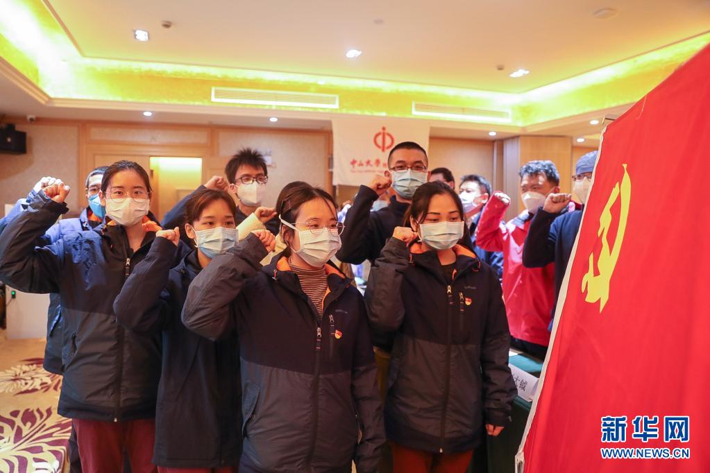 廣州中山大學(xué)附屬第一醫(yī)院馳援武漢醫(yī)療隊火線入黨的新黨員在武漢漢口醫(yī)院宣誓(2020年3月2日攝)。新華社發(fā)