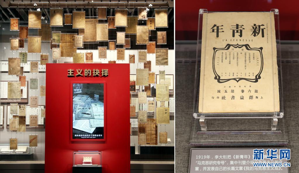這是6月1日在上海的中共一大紀(jì)念館拍攝的大型立體式視覺置景“主義的抉擇”,100件五四運動前后傳播馬克思主義、社會主義的報紙雜志,錯落陳列在玻璃墻上。其中,《新青年》第6卷第5號“馬克思研究專號”在前端“高光”展示,這期“專號”標(biāo)志著馬克思主義在中國的傳播進(jìn)入了較為系統(tǒng)的階段。新華社記者 劉穎 攝
