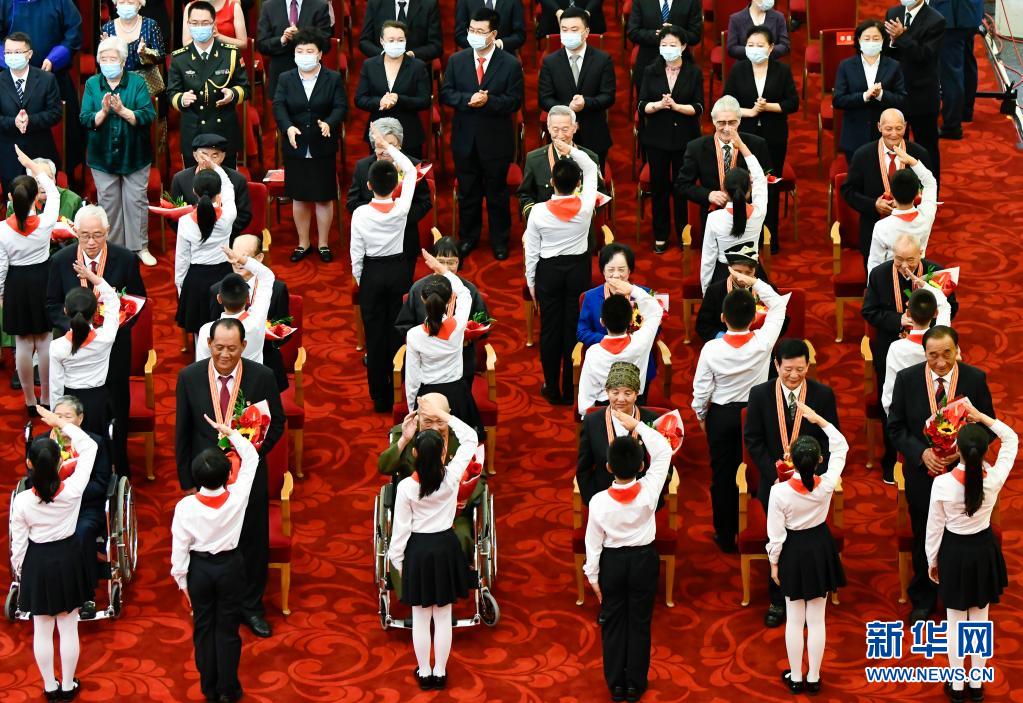 6月29日,慶祝中國共產(chǎn)黨成立100周年“七一勛章”頒授儀式在北京人民大會堂金色大廳隆重舉行。這是少先隊員向勛章獲得者獻(xiàn)花,敬禮致意。新華社記者 高潔 攝