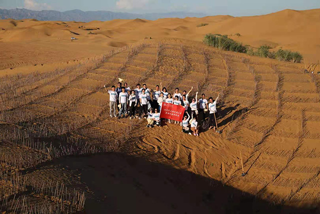 了解到這些后,他和同學立刻決定加入到這項工作當中,十個人一道,坐了一天一夜的綠皮火車,又經過6小時的汽車顛簸,來到了大漠深處,通過制作麥草方格治理荒漠,沒想到這一去,在之后的每年夏天,他們還帶領了更多的志愿者來到這個地方。他們都有一個共同的信念——“直到風沙止步”。