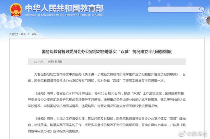 記者11日從教育部網(wǎng)站獲悉,國務(wù)院教育督導(dǎo)委員會辦公室日前印發(fā)專門通知,擬對各省“雙減”工作落實進(jìn)度每半月通報一次。據(jù)悉,各省自2021年8月30日起,每月15日和30日前,報送“雙減”工作落實進(jìn)度,國務(wù)院教育督導(dǎo)委員會辦公室在匯總分析后形成專項督導(dǎo)半月通報。通報重點是各地作業(yè)時間達(dá)標(biāo)學(xué)校情況、課后服務(wù)時間達(dá)標(biāo)學(xué)校情況、學(xué)科類培訓(xùn)機(jī)構(gòu)壓減情況、違規(guī)培訓(xùn)廣告查處情況和群眾舉報問題線索核查情況等。(記者王鵬)