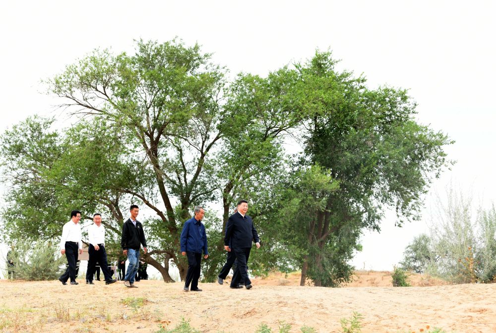 ↑2019年8月21日,習(xí)近平來到甘肅武威市古浪縣八步沙林場,實(shí)地察看當(dāng)?shù)刂紊吃炝?、生態(tài)保護(hù)等情況。