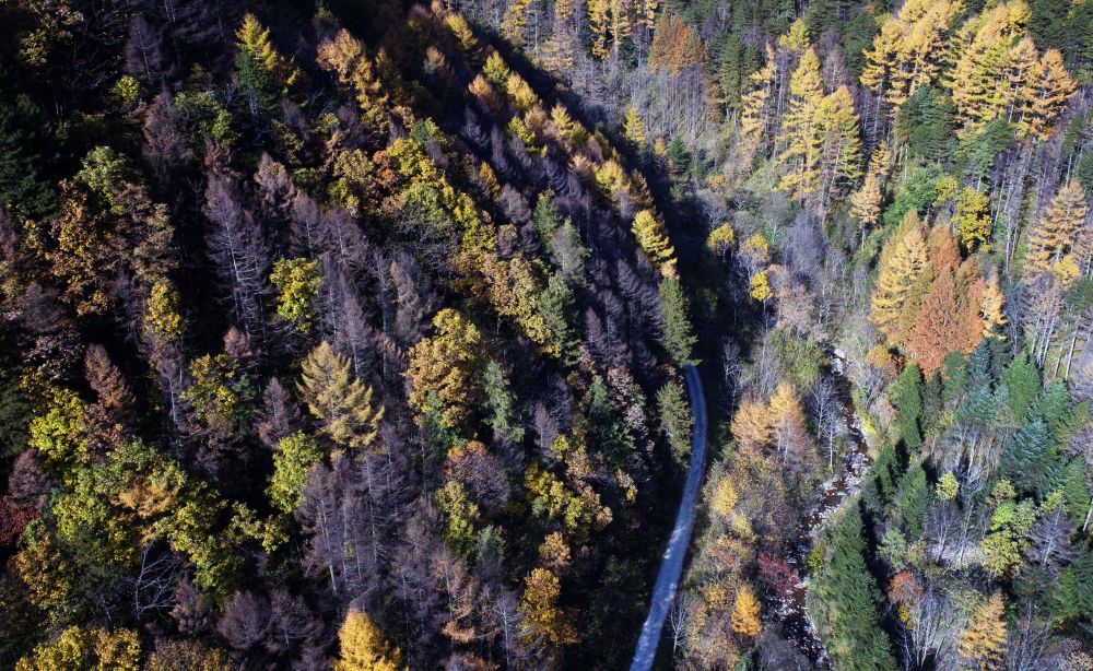 ↑秦嶺秋景(2018年10月26日攝,無人機(jī)照片)。