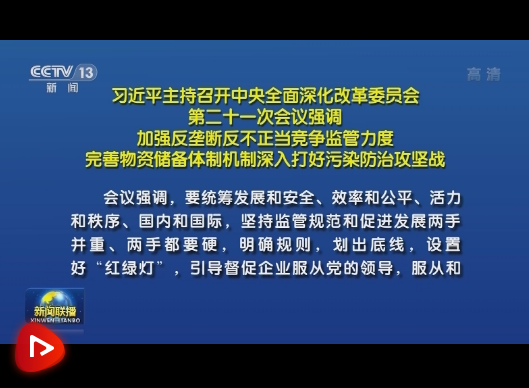 央視網(wǎng)消息(新聞聯(lián)播):中共中央總書(shū)記、國(guó)家主席、中央軍委主席、中央全面深化改革委員會(huì)主任習(xí)近平8月30日下午主持召開(kāi)中央全面深化改革委員會(huì)第二十一次會(huì)議,審議通過(guò)了《關(guān)于強(qiáng)化反壟斷深入推進(jìn)公平競(jìng)爭(zhēng)政策實(shí)施的意見(jiàn)》、《關(guān)于改革完善體制機(jī)制加強(qiáng)戰(zhàn)略和應(yīng)急物資儲(chǔ)備安全管理的若干意見(jiàn)》、《關(guān)于深入打好污染防治攻堅(jiān)戰(zhàn)的意見(jiàn)》、《關(guān)于更加有效發(fā)揮統(tǒng)計(jì)監(jiān)督職能作用的意見(jiàn)》。