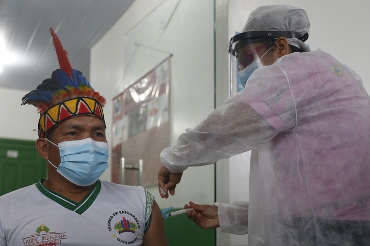 醫(yī)護人員在巴西亞馬孫州塔巴廷加市為一名原住民接種中國新冠疫苗(1月19日攝)。新華社發(fā)(盧西奧·塔沃拉攝)