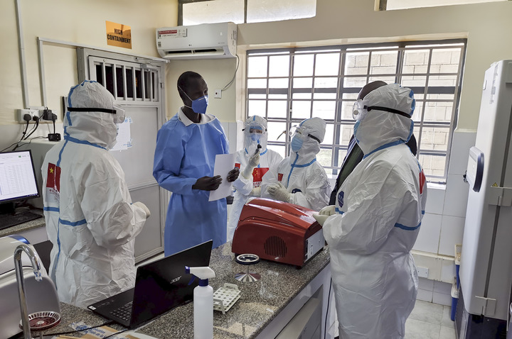 在南蘇丹首都朱巴的一處新冠病毒檢測機構,中國抗疫醫(yī)療專家組成員與南一線醫(yī)護人員交流(2020年8月21日攝)。新華社發(fā)(中國駐南蘇丹大使館供圖)