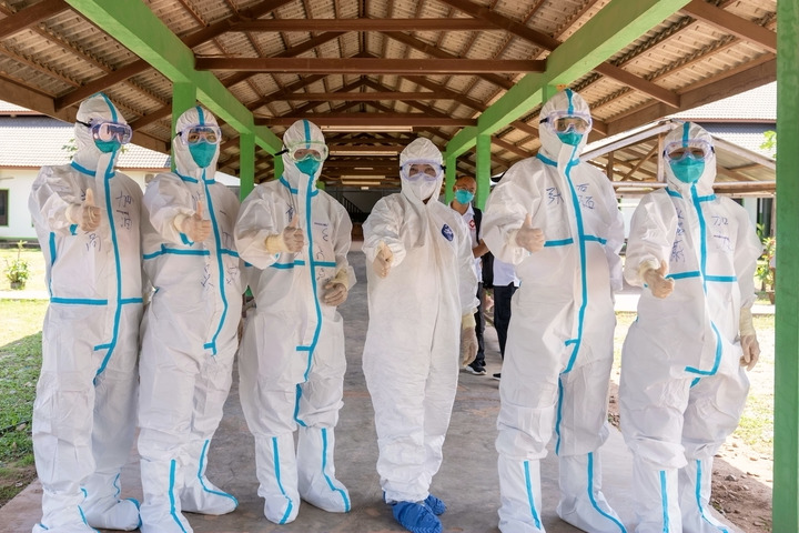 中國抗疫專家組在老撾北部烏多姆賽省準備進入新冠確診患者隔離病房(5月10日攝)。新華社發(fā)(農(nóng)麗春攝)