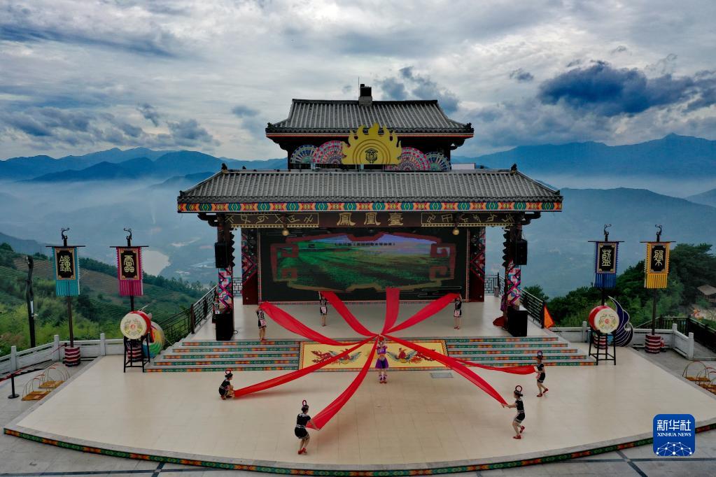 村民在福建省漳州市華安縣新圩鎮(zhèn)官畬村的鳳凰臺(tái)上表演畬族傳統(tǒng)舞蹈(資料照片)。新華社發(fā)