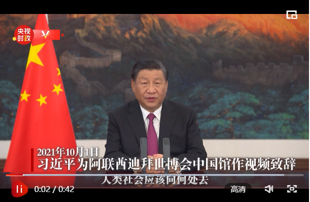 10月1日,國家主席習(xí)近平為阿聯(lián)酋迪拜世博會中國館作視頻致辭。