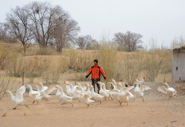 第三代治沙人郭璽在八步沙飼養(yǎng)家禽。人民網(wǎng) 王文嘉攝