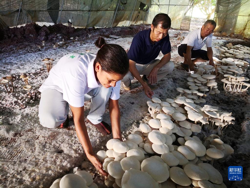 2018年6月12日,在斐濟(jì)楠迪,中國(guó)專家和當(dāng)?shù)毓蛦T檢查菌菇生長(zhǎng)情況。新華社記者張永興攝