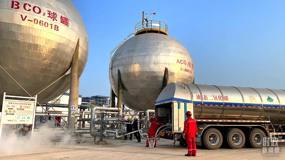 △油田工人將捕集后液化的二氧化碳裝車,運往油田。(總臺央視記者謝曉光拍攝)