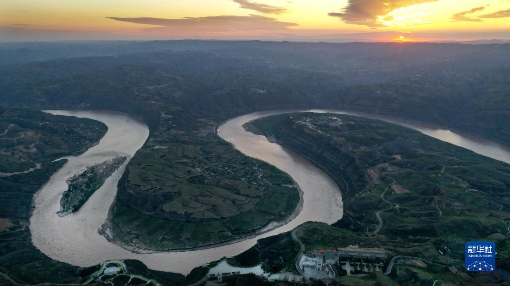 朝霞下的黃河乾坤灣(2019年8月14日攝,無人機照片)。新華社記者 陶明 攝
