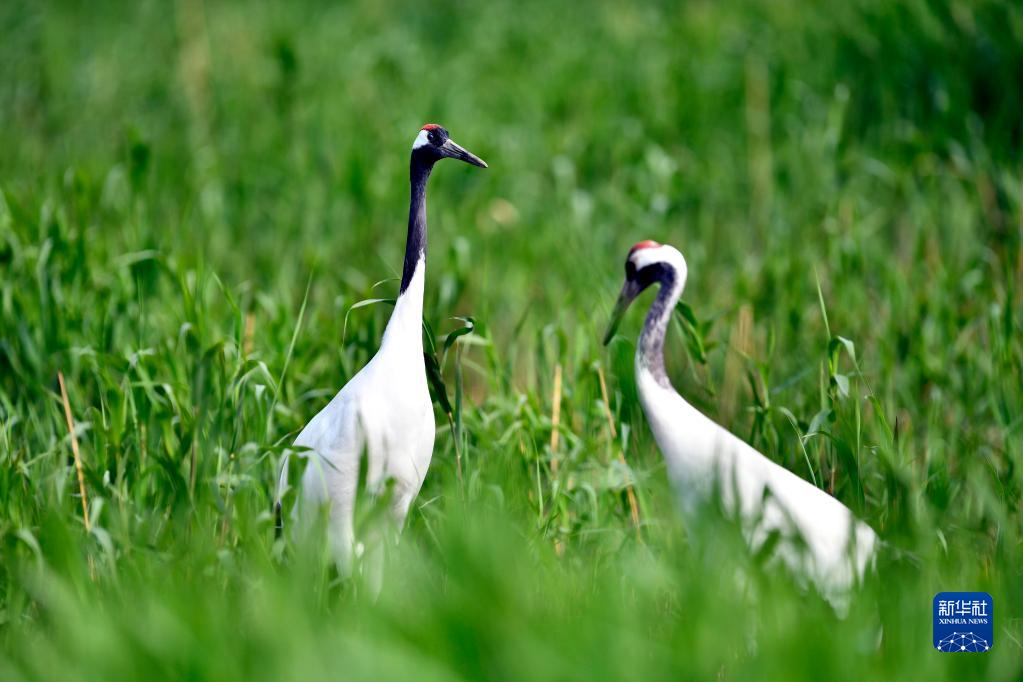 在山東黃河三角洲國家級自然保護區(qū),丹頂鶴在水草間棲息(2021年5月13日攝)。新華社記者 郭緒雷 攝