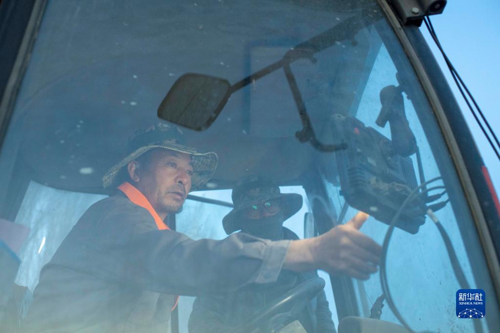 春播時(shí)節(jié),陸德文駕駛采棉機(jī)在棉田播種,兩名工人在車后跟隨保障,隨時(shí)進(jìn)行壓地膜、補(bǔ)充棉種和處理故障等作業(yè)(4月14日攝)。新華社記者 胡虎虎 攝