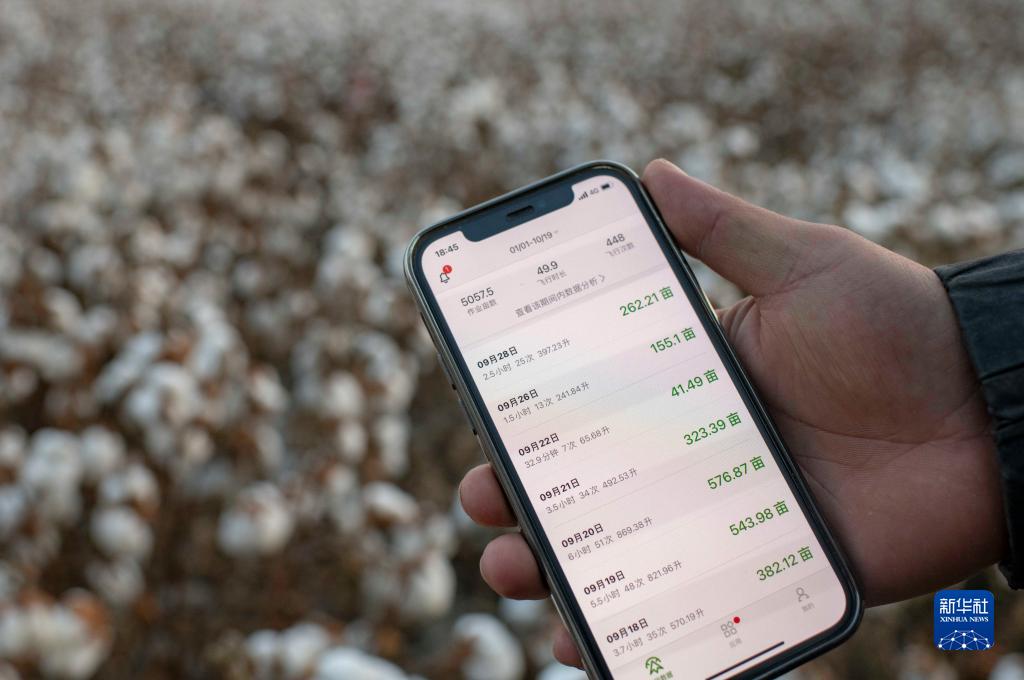 秋收時(shí)節(jié),陸德文展示自己使用無人機(jī)為自家和其他農(nóng)戶棉田打落葉劑的飛行數(shù)據(jù)(10月19日攝)。在親身感受過無人機(jī)飛防作業(yè)的便捷后,老陸家在今年8月買了一臺。新華社記者 胡虎虎 攝