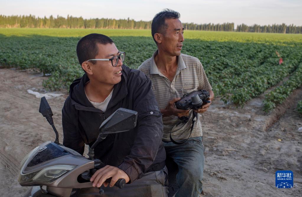 盛夏田間管理期間,陸高林的兒子陸德文(左)騎摩托車帶著農(nóng)業(yè)植保無人機(jī)操作手圍著棉地規(guī)劃飛防作業(yè)路線(7月15日攝)。新華社記者 胡虎虎 攝