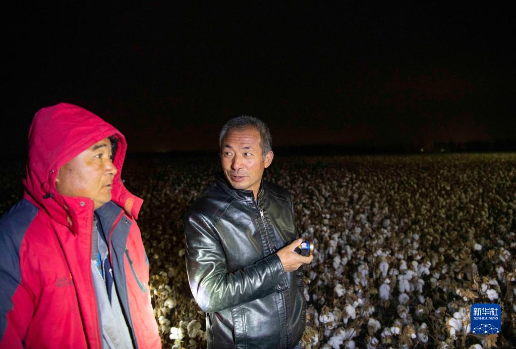 在新疆塔城地區(qū)沙灣市大泉鄉(xiāng)三道溝村,夜幕降臨后,陸高林(右)在等待采棉機(jī)轉(zhuǎn)場,并與采棉機(jī)老板商量棉花采收進(jìn)展(10月22日攝)。新華社記者 胡虎虎 攝